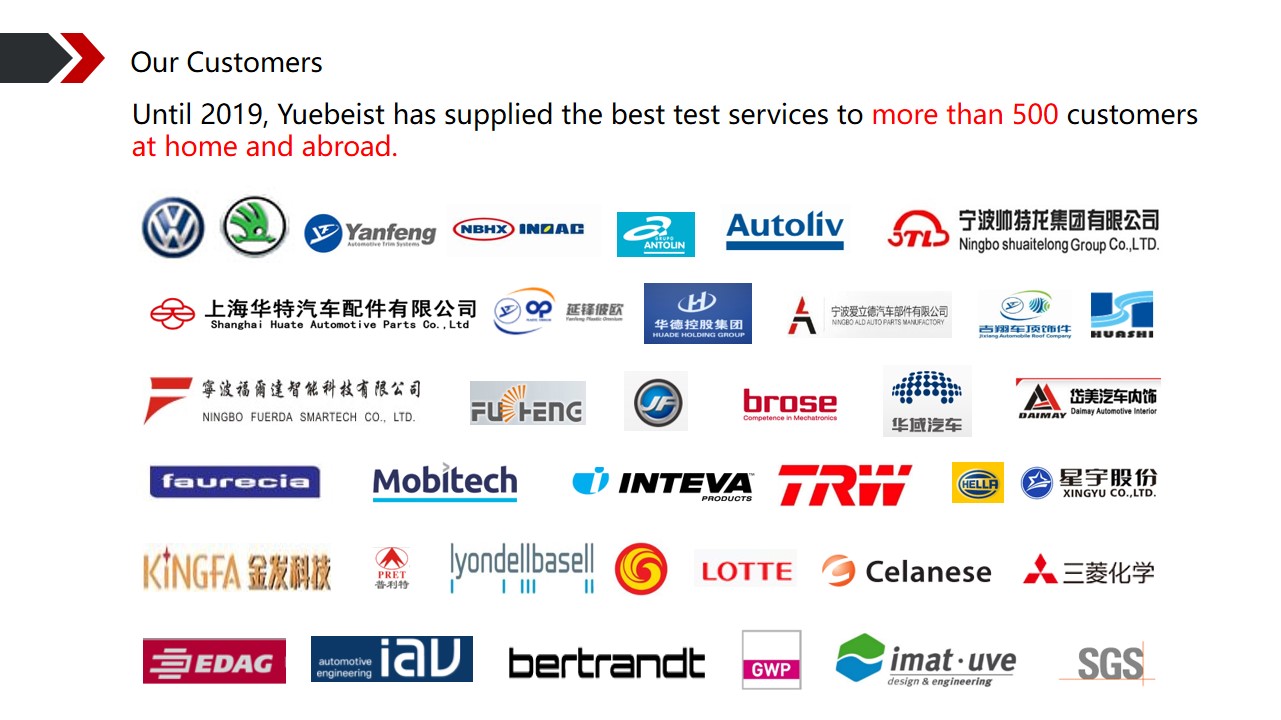 Shanghai Huiyue Test Technology Co., Ltd. is an independent third-party testing agency with its headquarters in Anting, Shanghai, which includes three test foundations in Shanghai, and one branch in Changchun. The company focuses on the function and material inspection of interior and exterior parts of the car. The company is not only able to complete the basic inspection projects in the industry, but also has the domestic leading vehicle climate test, component function test, interior trim distribution test (cube warehouse method) and other qualifications. As an independent, fair and professional testing organization, the company can provide customers with suggestions for improving unqualified parts and materials while ensuring the objectivity of its testing service, so as to really help the development of the enterprise!