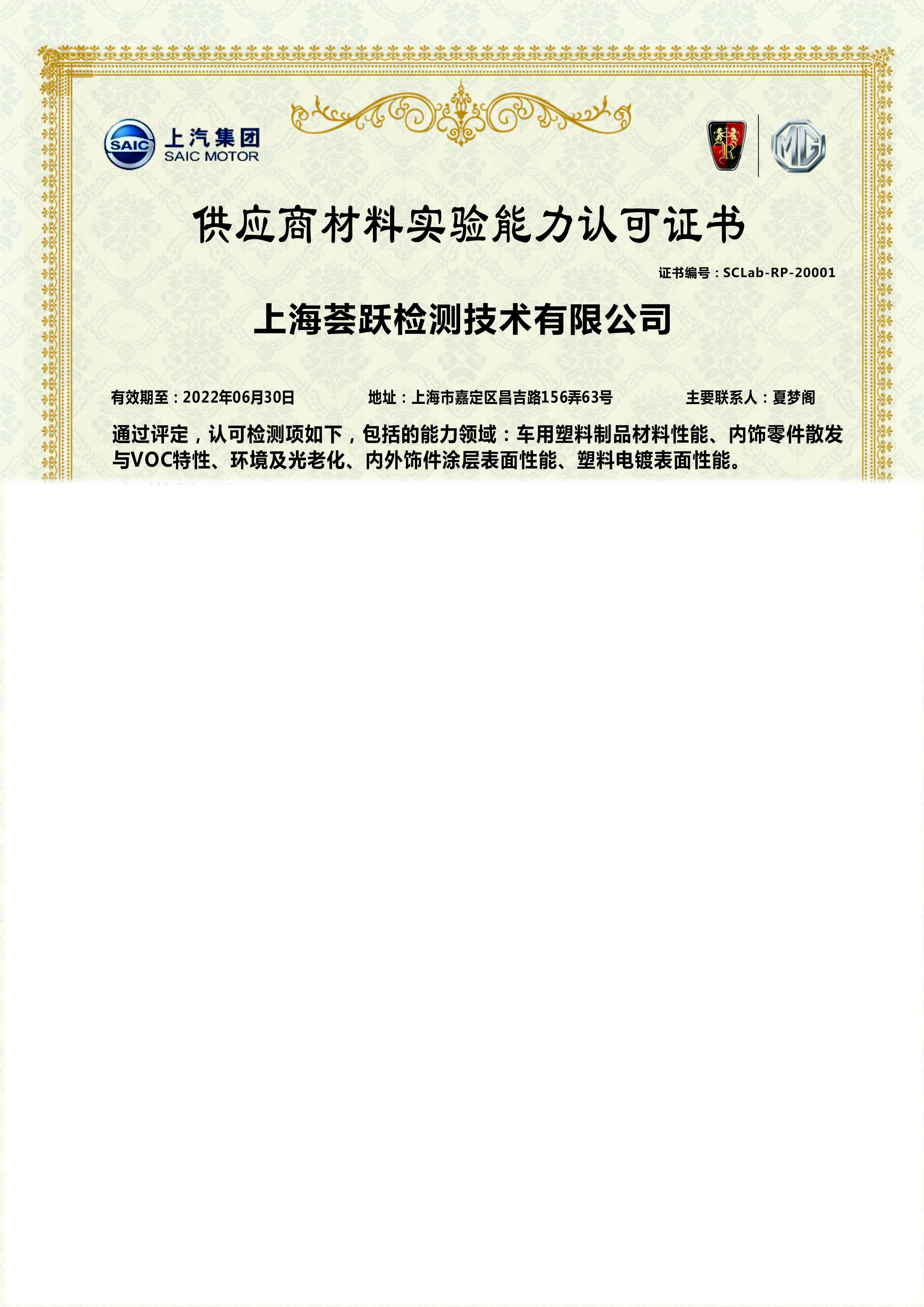 SAIC Volkswagen material laboratory accreditation certificate