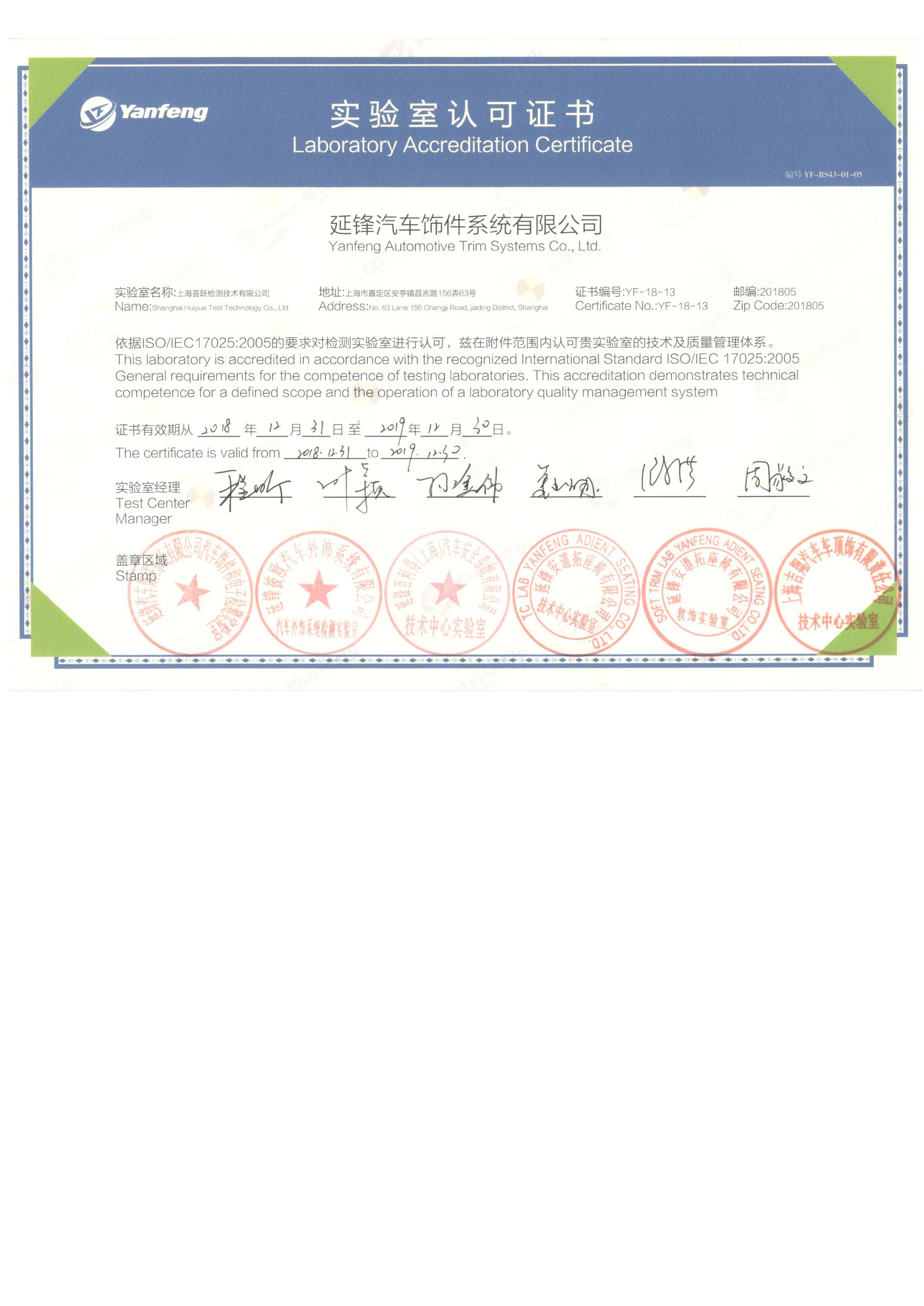 Yanfeng System Laboratory Accreditation Certificate