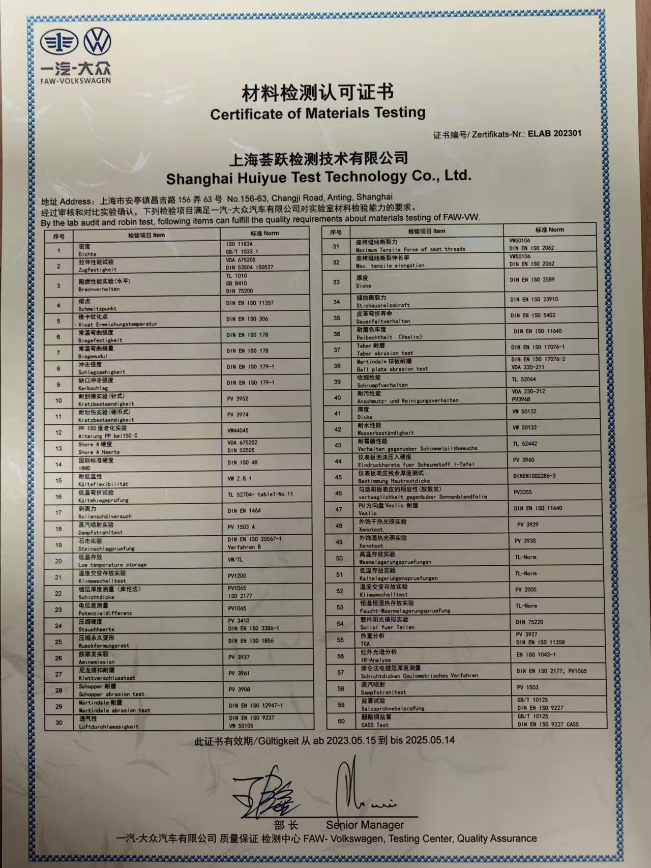 荟跃检测成为一汽大众汽车有限公司材料检测授权认可的第三方实验室,认可的范围包含:内外饰材料性能、环境及光老化、涂层表面、塑料电镀表面等相关性能测试。详情敬请登录查询我司官网(http://www.hyuetest.com/)-荣誉资质